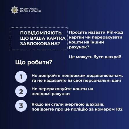 Запам’ятайте головне: якщо вас лякають, тиснуть і кваплять із рішенням — це шахраї. Аферисти навмисно створюють паніку, щоб ви не встигли порадитися з рідними чи перевірити отриману інформацію; переказ коштів «для збереження» або «на безпечний рахунок» — прямий шлях до втрати грошей; жоден банк, фінансова установа чи їхні працівники не мають права вимагати реквізити картки, PIN-код, CVV або просити здійснювати будь-які перекази. Як діяти у разі підозрілого дзвінка: