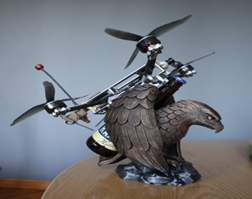 Композиції з трофейного БпЛА і трофейного пива на підставці у вигшляді орла та композиція з трофейного бпла і трофейного вина на підставці у вигляді червоного дракону. Трофеї захоплені одним з підрозділів ГУР в Суджі Курської області.