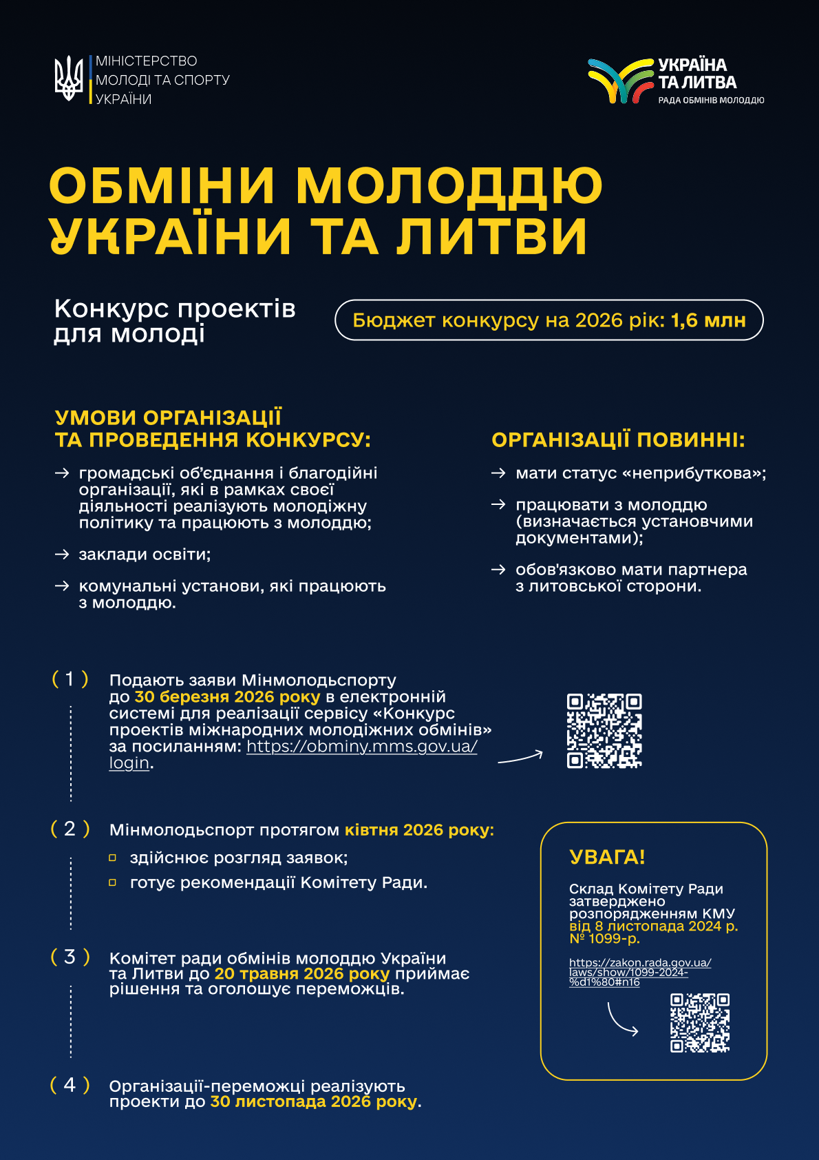 Міністерство молоді та спорту України оголошує прийом заявок на участь у конкурсі з реалізації проєктів у межах обмінів молоддю України та Литви у 2026 році.