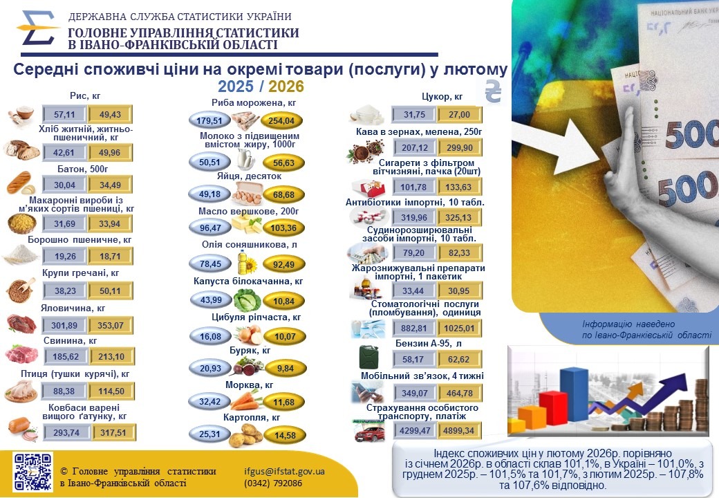 Головне управління статистики в Івано-Франківській області повідомляє. За даними Державної служби статистики України, інфляція на споживчому ринку в лютому п.р. порівняно із січнем п.р. в області склала 1,1%, в Україні1 – 1,0%, з груднем 2025р. – 1,5% та 1,7%, з лютим 2025р. – 7,8% та 7,6% відповідно.